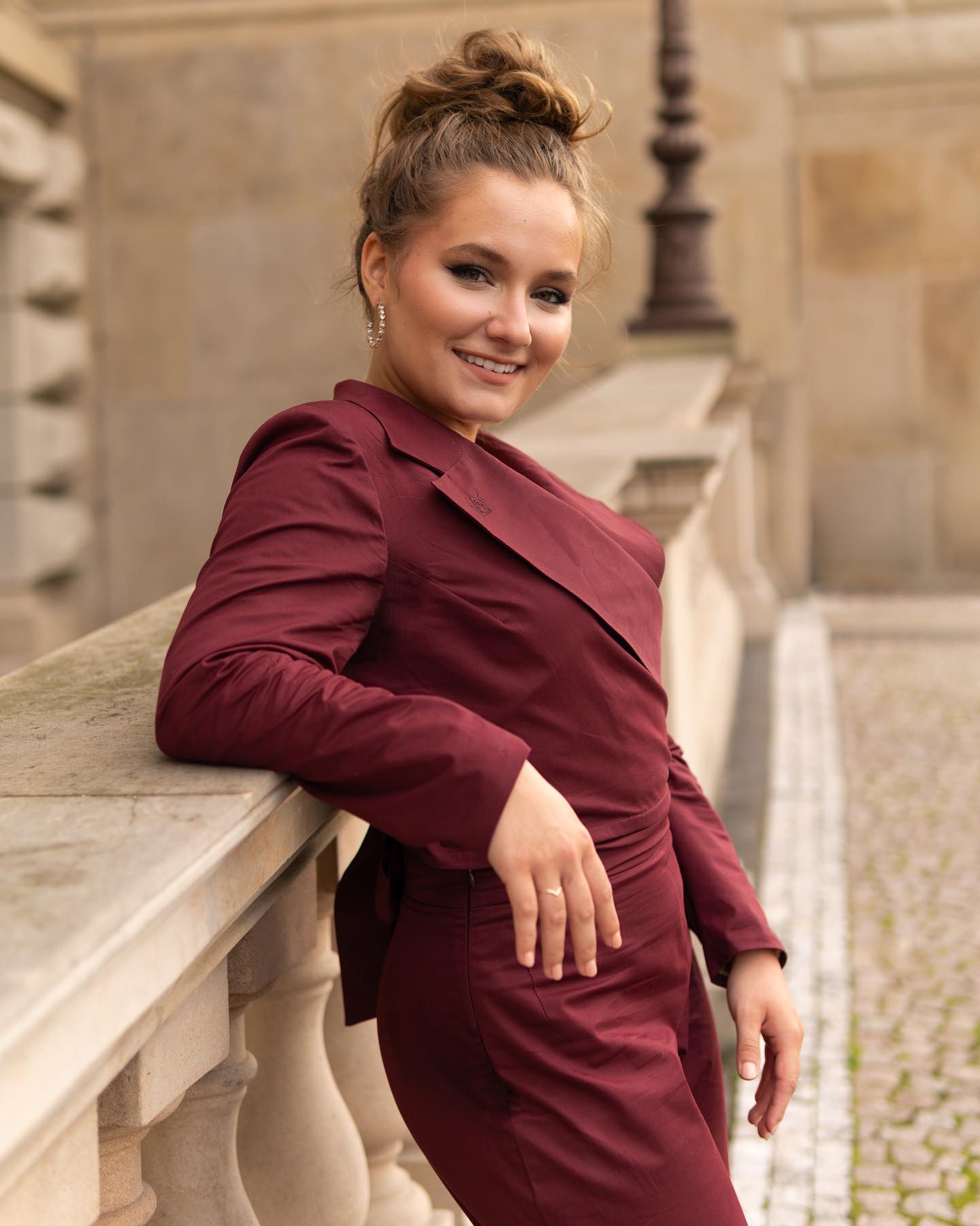 Tento oblek od Cameronni je oslavením ženské elegance s moderním nádechem. Kratší sako a zavazování vzadu spojují tradiční sofistikovanost s novým, odvážným pohledem na ženskou siluetu. Ušitý z prémiové látky s prodyšnou viskózovou podšívkou, je dokonalou rovnováhou mezi luxusem, pohodlím a kreativním designem. Každý detail je navržen tak, aby podtrhl vaši originalitu a nechal vás zazářit s každým krokem.
